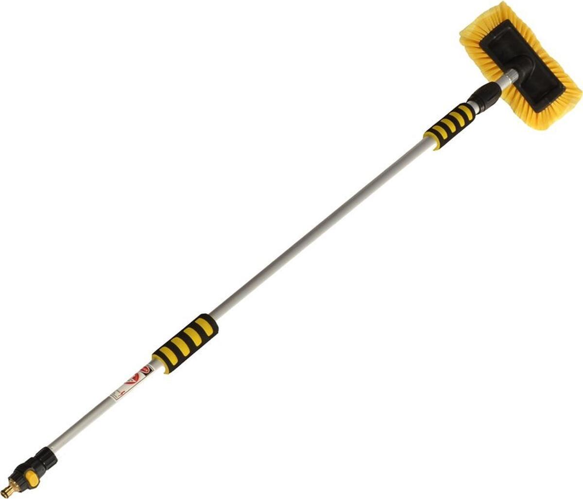 Telescopic washing brush with quick connection and ON/OFF switch.