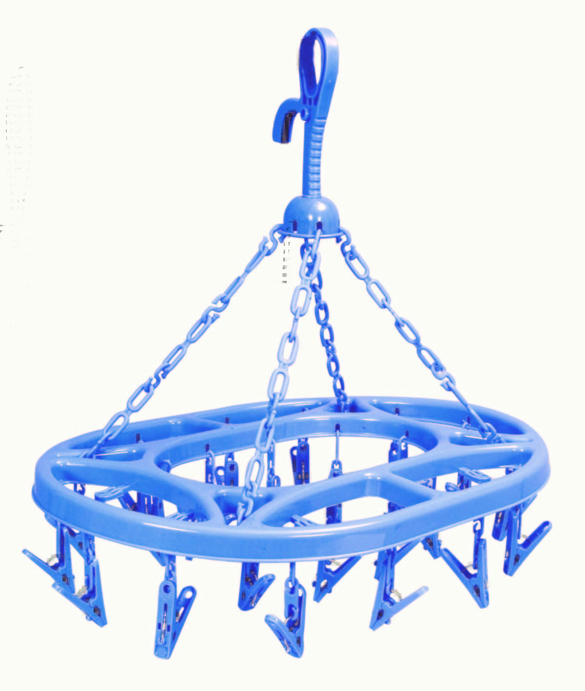 Round laudry airer made of plastic featuring 10 folding arms and 20 clips.