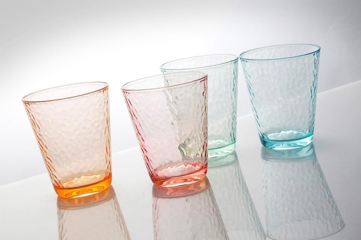 Elegant drinking glass set in vintage look. Stackable shape. Material: food-safe polycarbonate. Assorted colors.