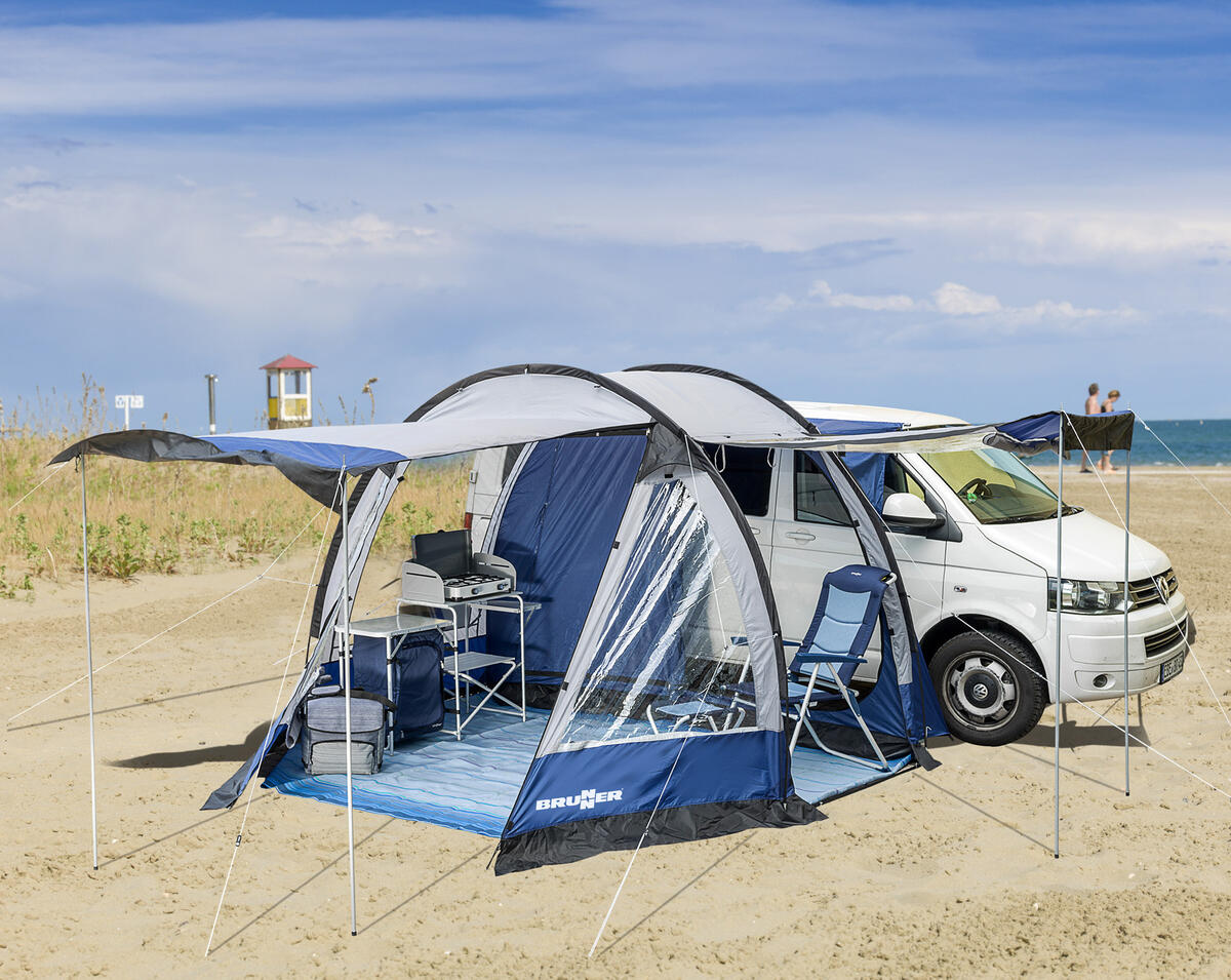 Compact free standing drive-away awning, suitable for connection to vehicles with a gutter height of 180-220 cm. Standard accessories: flysheet, connection pole, guy ropes, pegs, carry bag.