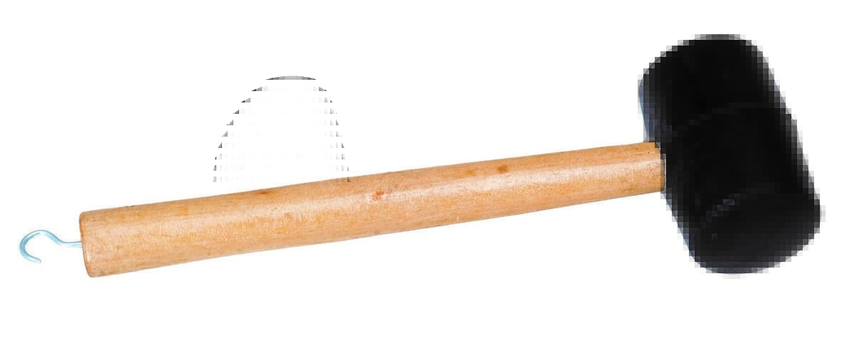 Tent peg mallet with wooden handle and heavy rubber head.